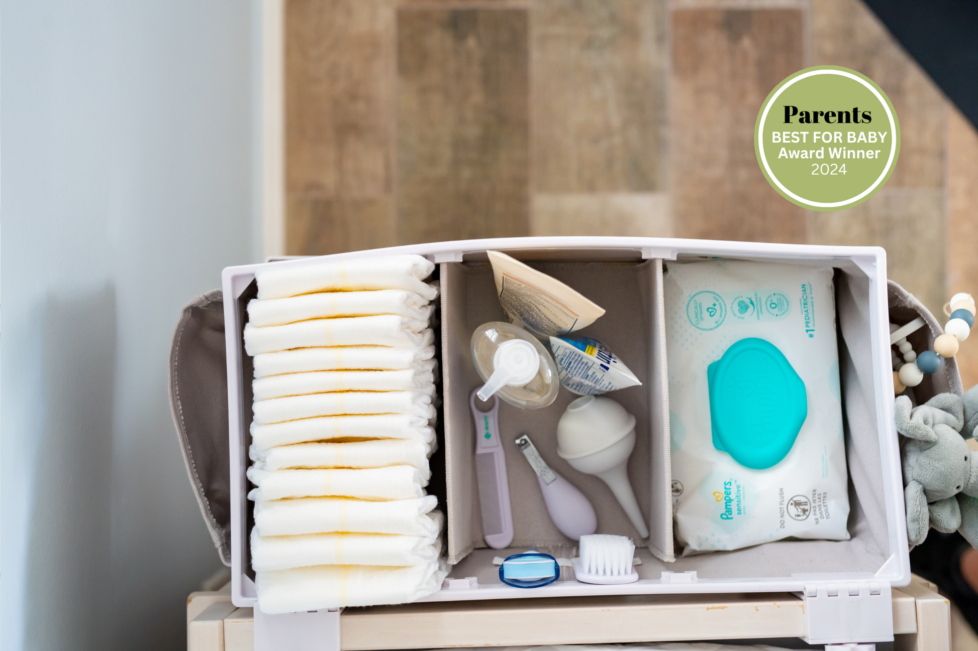 Monkey Caddy is a multi-functional diaper changing solution. It can be configured in a variety of ways to help hold all products and accessories you need while changing a baby. Monkey Caddy is equipped with a small pull-out table, exterior pockets, elastic holders, pull-out hooks and customizable interior dividers. Our patented design allows you to customize your Monkey Caddy to suit your baby changing needs. The Monkey Caddy is also collapsible to make for easy storage and transportation. Care: Spot clean with your preferred mild cleaning product.